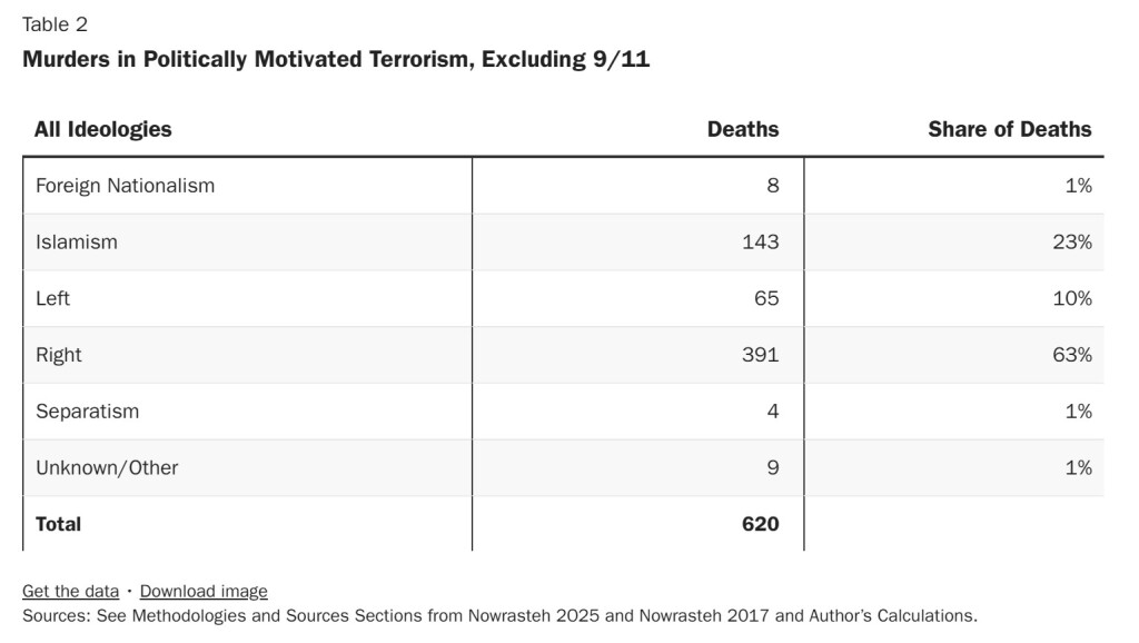 Related: Alex Nowrasteh & David Bier on “Politically Motivated Violence is Rare in the United States,” showing the death tolls for Left and Right killers. Here is their “Politically Motivated Terrorist Killers: Data, Sources, and Methodology”